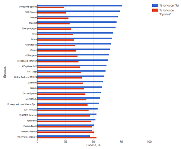 По истечении каждого месяца результаты голосования обнуляются. Голосование с начала каждого месяца с чистого листа позволяет нам определять победителя рейтинга брокеров фондового рынка более объективно. Все брокеры в рейтинге расположены в соответствии с актуальным количеством голосов «за» и «против».