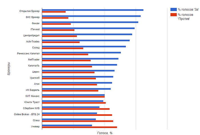 По истечении каждого месяца результаты голосования обнуляются. Голосование с начала каждого месяца с чистого листа позволяет нам определять победителя рейтинга брокеров фондового рынка более объективно. Все брокеры в рейтинге расположены в соответствии с актуальным количеством голосов «за» и «против».